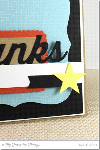 The new Blueprints 19 Die-namics are so fun and I LOVE the suggested sketches (you can find them HERE on the MFT Blog). I cut the frame from Berrylicious Card Stock and stamped it with the Burlap Background using Sweet Tooth Pigment Ink. I used Tangy Orange Card Stock for the scalloped rectangle panel, and Kraft Card Stock for the rectangle panel inside. The horizontal panel was cut from Smooth White Card Stock and I used Black Licorice for the little flag. The star was cut from Banana Split Card Stock. I cut “thanks” from Many Thanks using Black Licorice Card Stock and I stamped it with the new Fine Check Background using Black Licorice Premium Dye Ink.