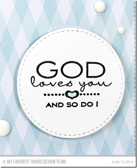 I wrapped the panel using Hemp Cord and then added a bow. The sentiment, “God Loves You and So Do I”, from LJD Cheerful Blessings, using Black Licorice Premium Dye Ink onto a panel of Sweet Tooth Card Stock cut with the Stitched Circle STAX Die-namics.  I used Copic Markers to highlight the heart in the center of the sentiment.  I finished off the card with a trio of matte white enamel dots.